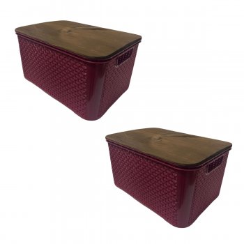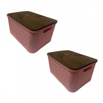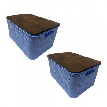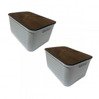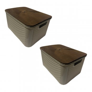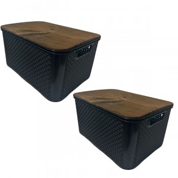 KIT 02 CAIXA ORGANIZADORA DE 18L RATTAN COM TAMPA DE MADEIRA DE PINUS
