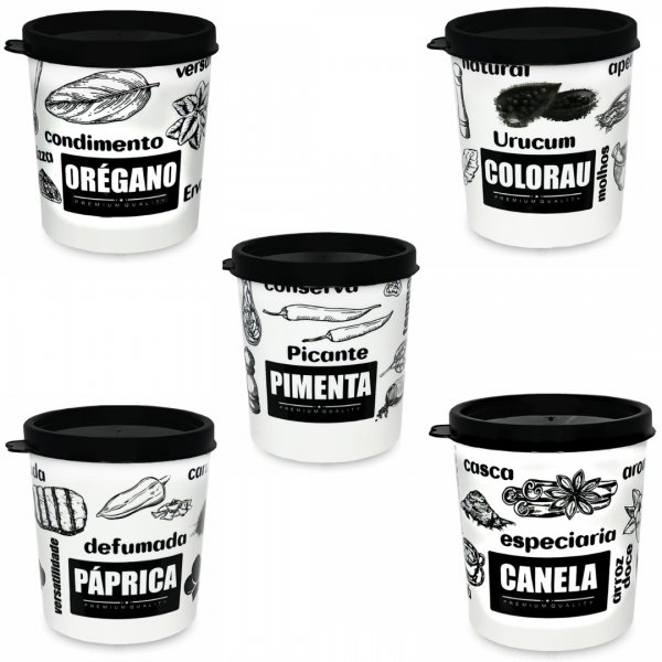 Jogo de Condimentos 5 Peças Material: Plástico Capacidade: 200ml Kit composto com as decorações: 1 Condimento Pimenta 1 Condimento Canela 1 Condimento Colorau 1 Condimento Orégano 1 Condimento Páprica Todos com tampas com excelente vedação.